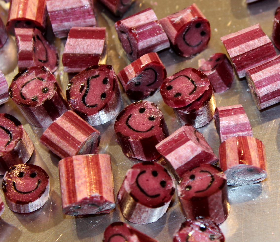 Bonbons mit filigranen, aufwendigen Mustern und Botschaften zu bestücken, das ist in Zeiten von 3D-Druckern wohl schon längst kein Problem mehr. Als technischer Laie habe ich häufig den Eindruck, eine Maschine könne einfach alles „ausspucken“, wenn man sie nur mit den passenden Rohstoffen befüllt und gleichzeitig die richtigen Knöpfchen drückt. Schon beeindruckend… Viel faszinierender finde ich allerdings, wenn Menschen das gleiche – oder ein besseres – Ergebnis herstellen und dabei ganz auf großes High-Tech verzichten. Für unser zauberhaftes „Smiley-Bömsken“ braucht es nämlich keine Maschine und nur wenige Werkzeuge, dafür aber ganz viel Know-how und die geschickten Hände der Bonbonmacher Peter Stöpel, Marina Föllmer und Timo Bernsmann: