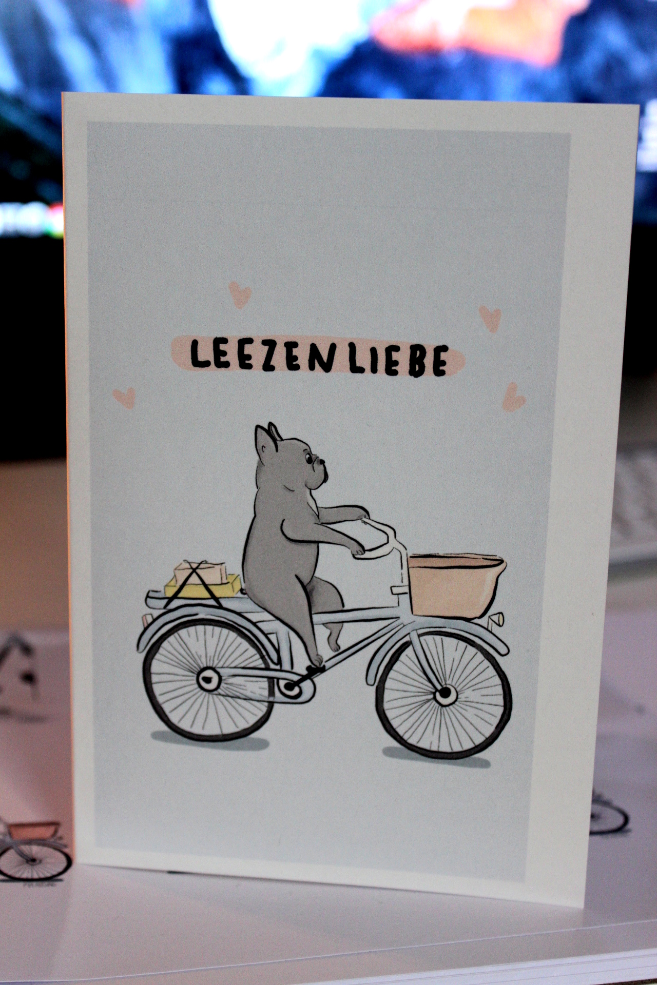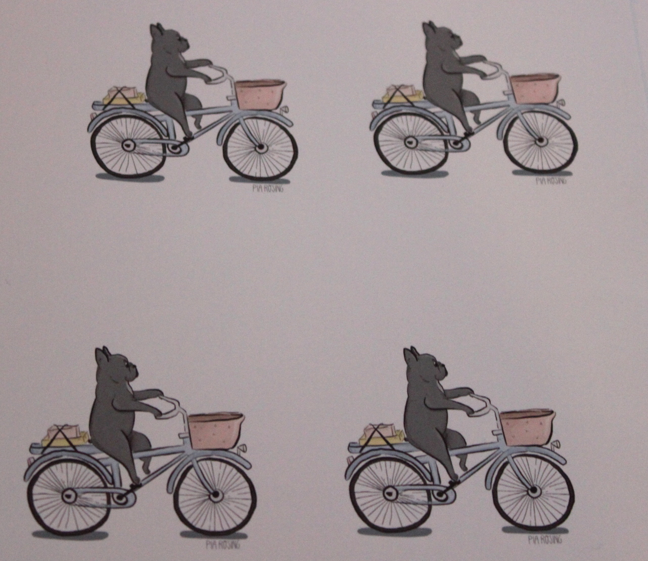 Während ich mich noch genüsslich kauend an sie schmiege – ja, auch ein harter Kerl hat seine weichen Momente – zaubert sie mich innerhalb weniger Minuten auf´s Papier, und zwar beim Fahrradfahren. Eine französische Bulldogge fährt auf dem Drahtesel durch Münster, darauf muss man erstmal kommen… Mir jedenfalls bleibt in solchen Momenten regelmäßig die Kaustange im Hals stecken – nicht, dass Frauchen noch auf die Idee kommt, dass ich das wirklich noch machen muss. Und dann wahrscheinlich auch noch im Regen!?